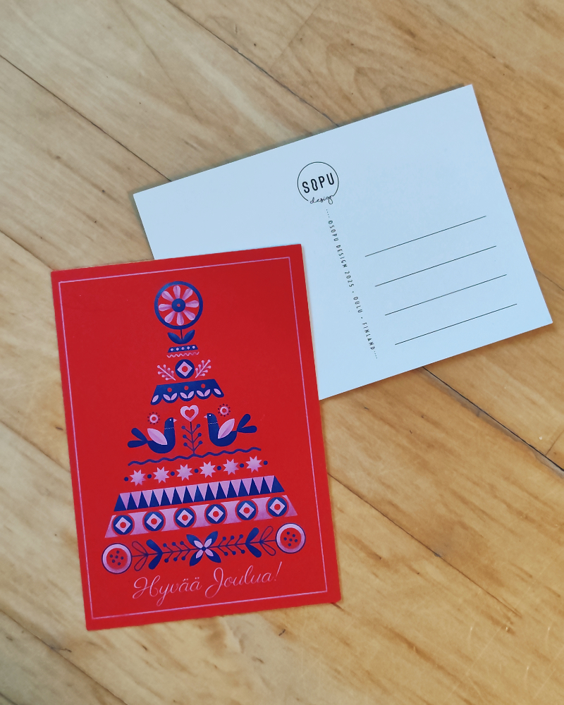 JOULUPUU-kortti on syntynyt kuvittaja Ada Heleniuksen, SOPU designin toisen osapuolen, kynästä. Kortin voi lähettää perinteiseen tapaan postitse tai sen voi kehystää seinälle tuomaan arkeen ripauksen ihanuutta.
